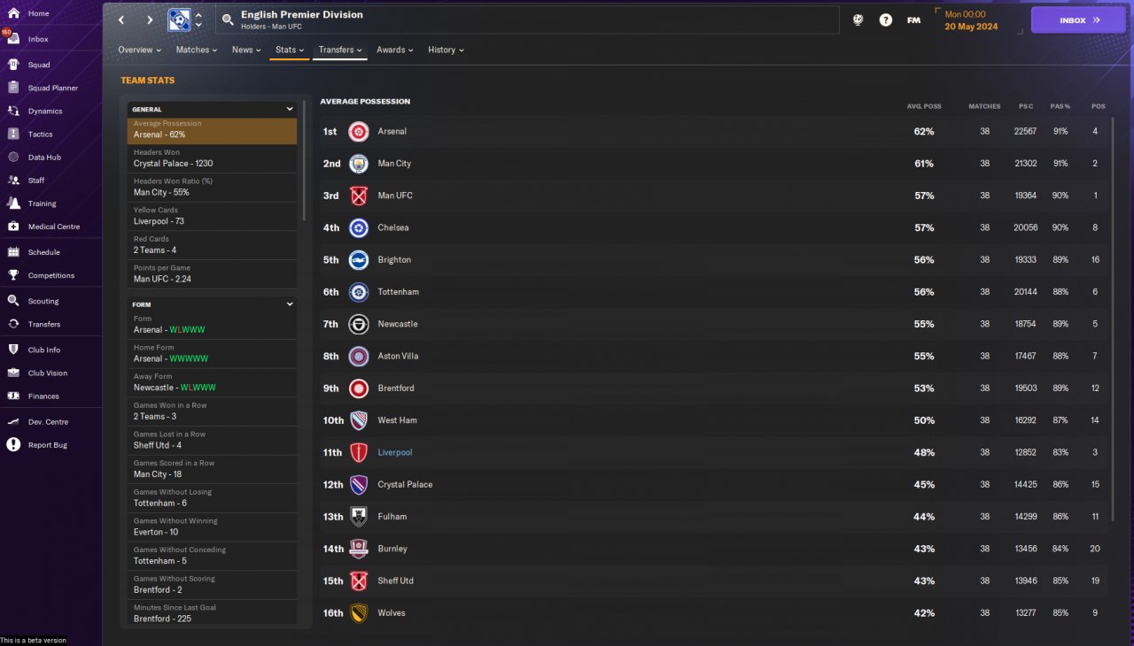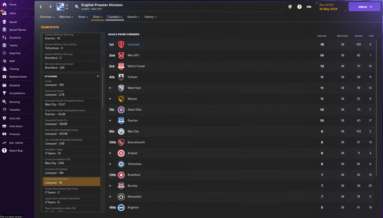The result of this test should be taken with a grain of salt because during the test I delegated the training, team talks and set pieces to the assistant manager and went on Holiday until the end of the season.