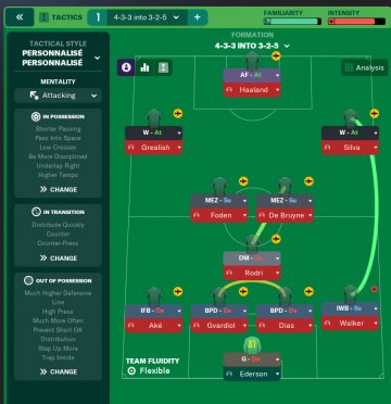I wanted to create a tactic with the new game engine, playing with Guardiola's 5 lanes. But in truth, it's all inspired by City's style of play. I don't think the performance is optimal, but I got a result that's close to what I wanted, so I wanted to see what it's really worth.