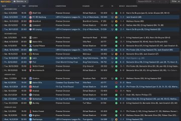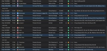 The schedule shows a few matches where the team underperformed against weaker opponents. Arsenal beat us three times, Chelsea and ManU once. Note the heavy loss against Leipzig, 2-5.