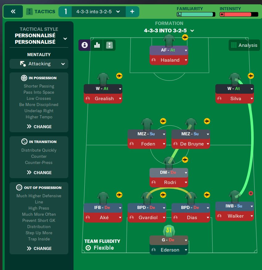 I wanted to create a tactic with the new game engine, playing with Guardiola's 5 lanes. But in truth, it's all inspired by City's style of play. I don't think the performance is optimal, but I got a result that's close to what I wanted, so I wanted to see what it's really worth.