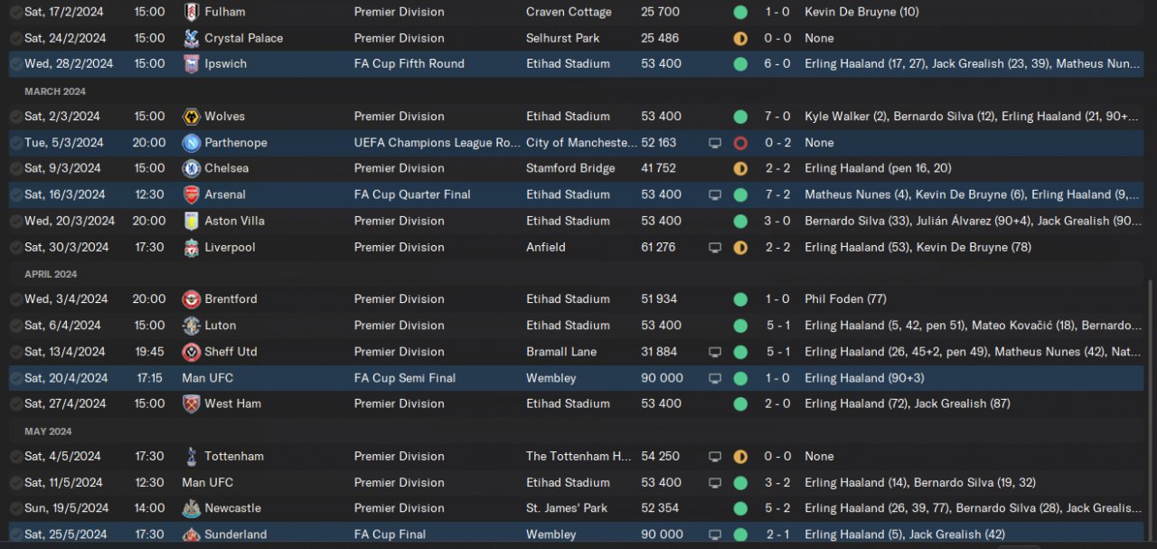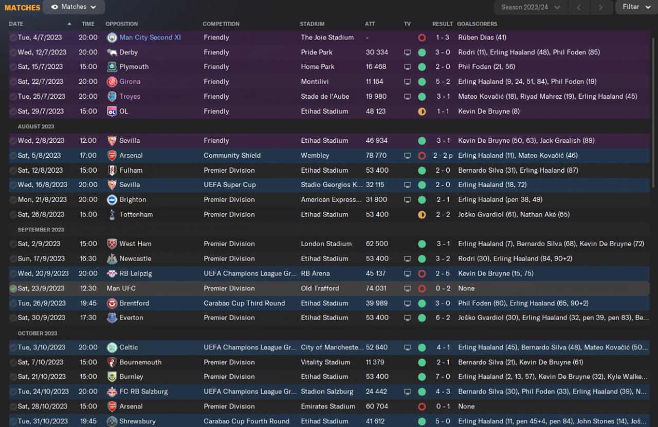 The schedule shows a few matches where the team underperformed against weaker opponents. Arsenal beat us three times, Chelsea and ManU once. Note the heavy loss against Leipzig, 2-5.