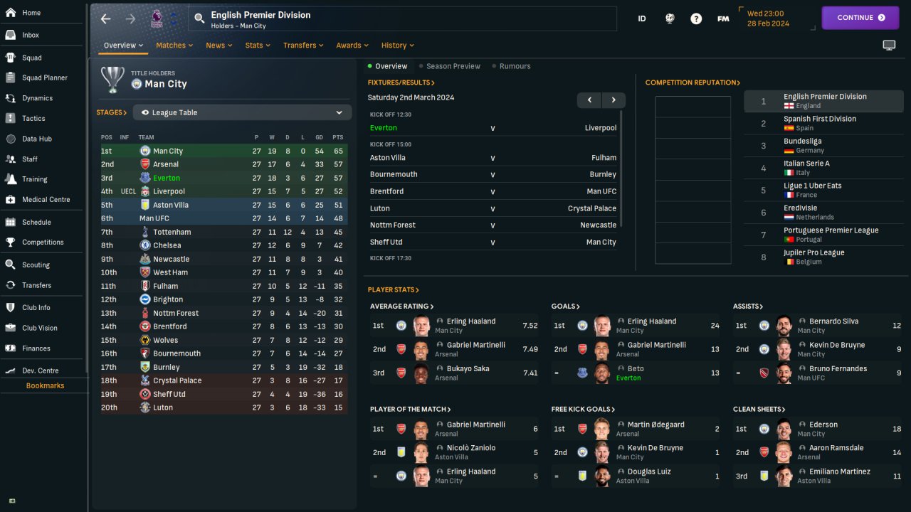 Season 1, no transfers, default squad: After 27 games I am currently sitting joint 2nd in the Premier League with Everton at 57 points (2.11 points/ game).