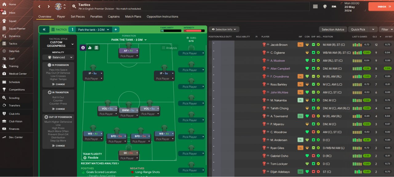 I choose Luton because they always finish bottom first season in my saves. I have tried to make defensively solid 1 DM tactics, but so far it seems impossible, you just get caught on the counter way too often and leave too big spaces between defense and midfield. We use double volante to make up for our extremely defensive shape, and get penetration that we are lacking. I like this also because this is actually a lower possession tactic (45% average for this season).