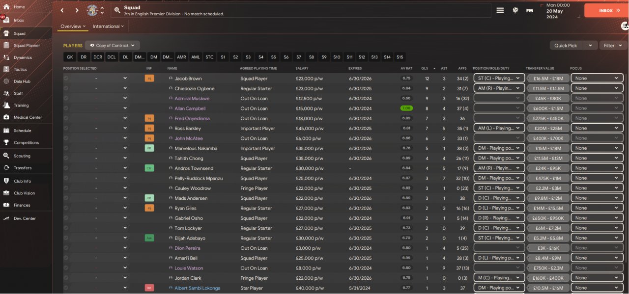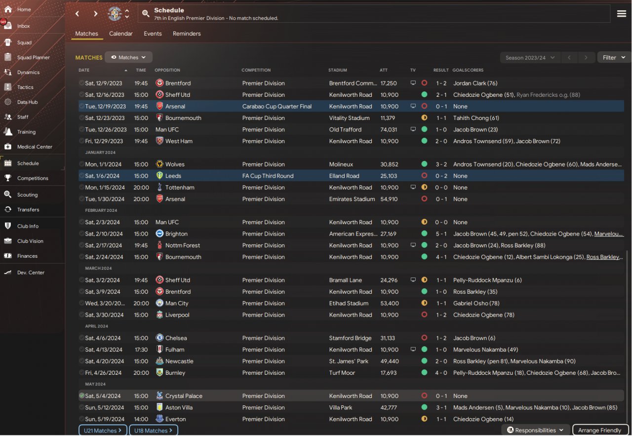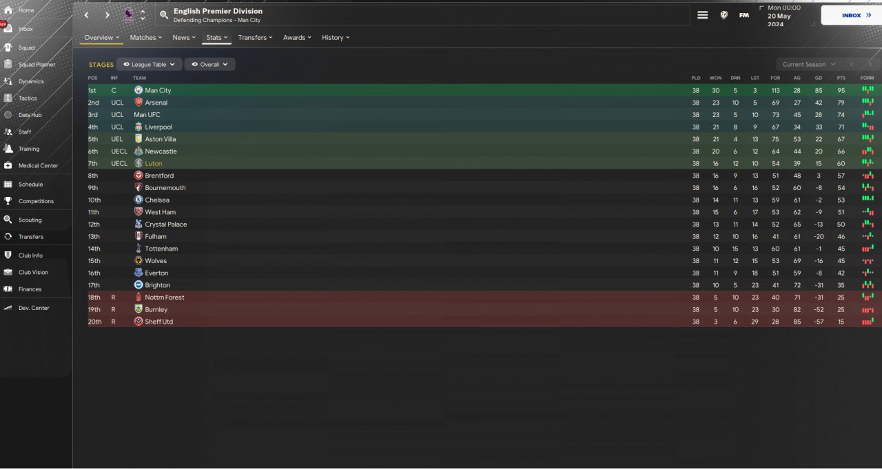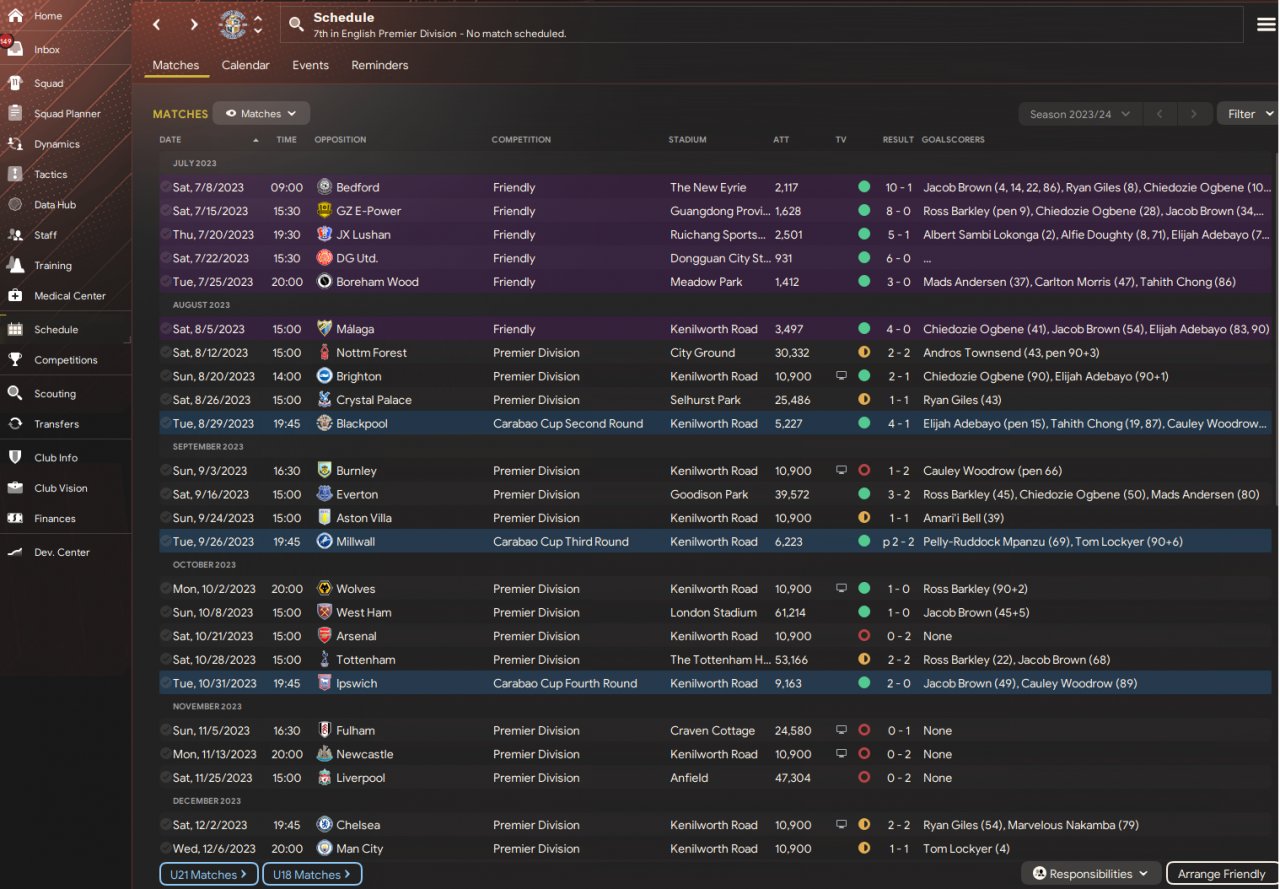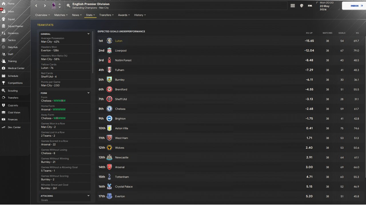 Once I was happy with the way we were playing, I did a holiday test with Luton. While 7th place is maybe not incredible, I was happy to only concede 39 goals in 38 games. I should add that we underperformed our xG by 15 (worst in the league), while our xgc was pretty on the money.