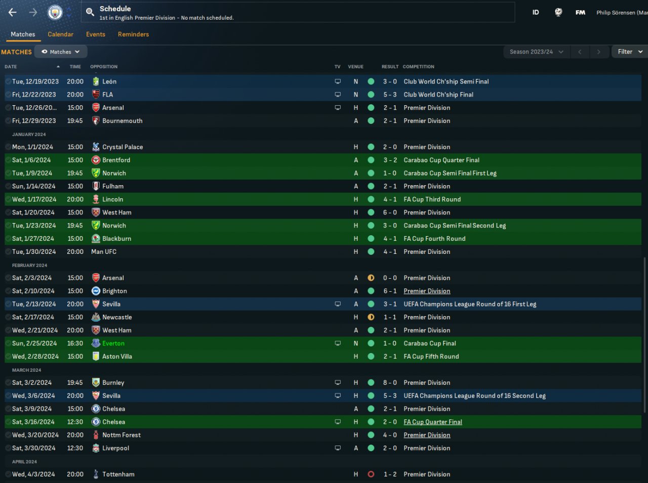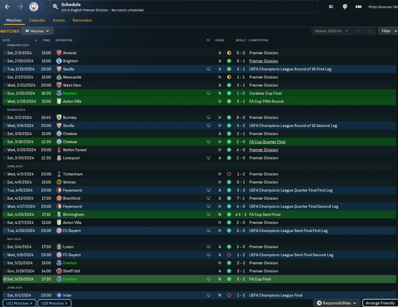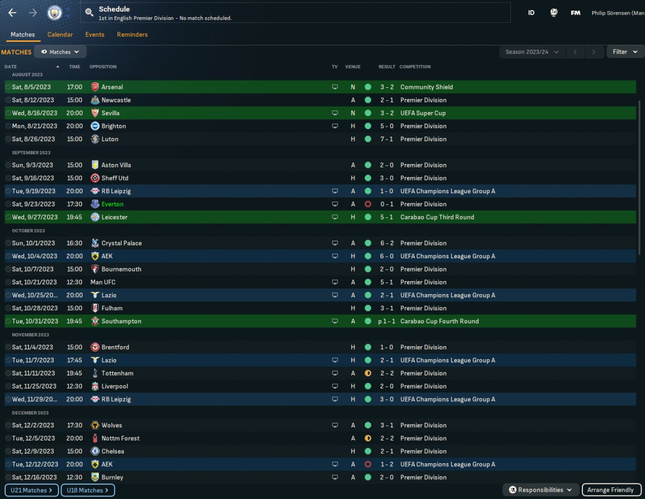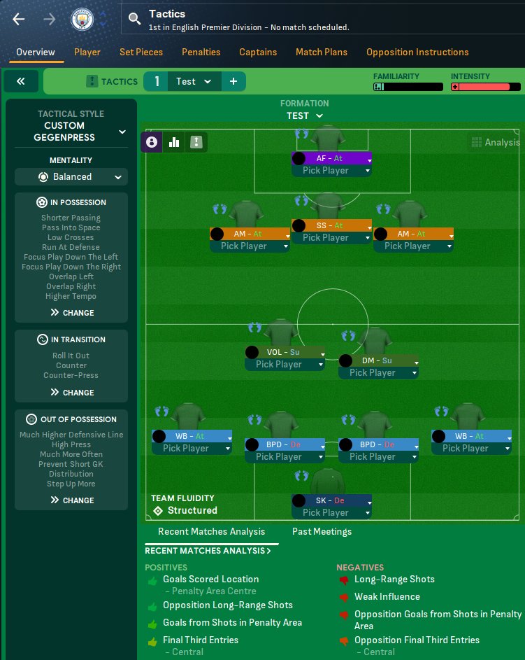 A narrow 4231, aimed to be defensively solid. Trades some firepower for clean sheets. Did holiday test with Man city + Everton, finished 1st and 2nd. (They also played each other in both cup finals).