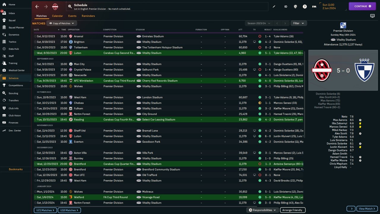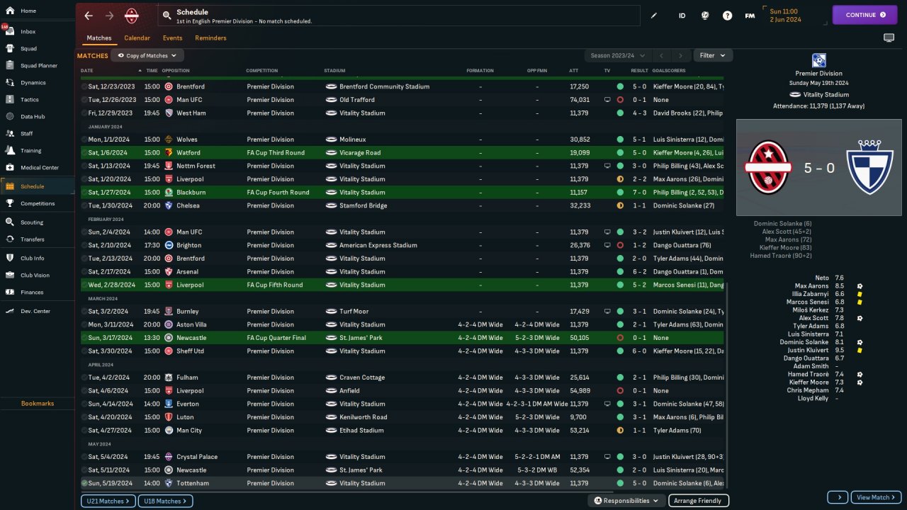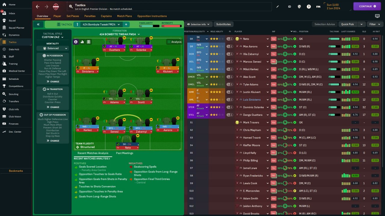 Recreation of 424 Bombyte Tweak from FM 23. Basically all meta TI / PI included. Bournemouth, champions season 1, no transfers.