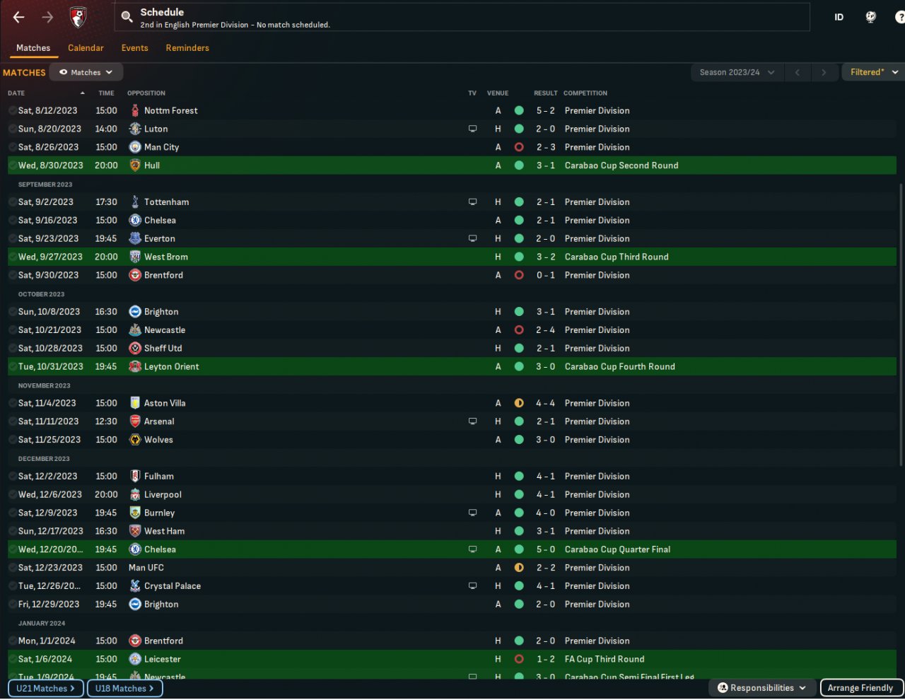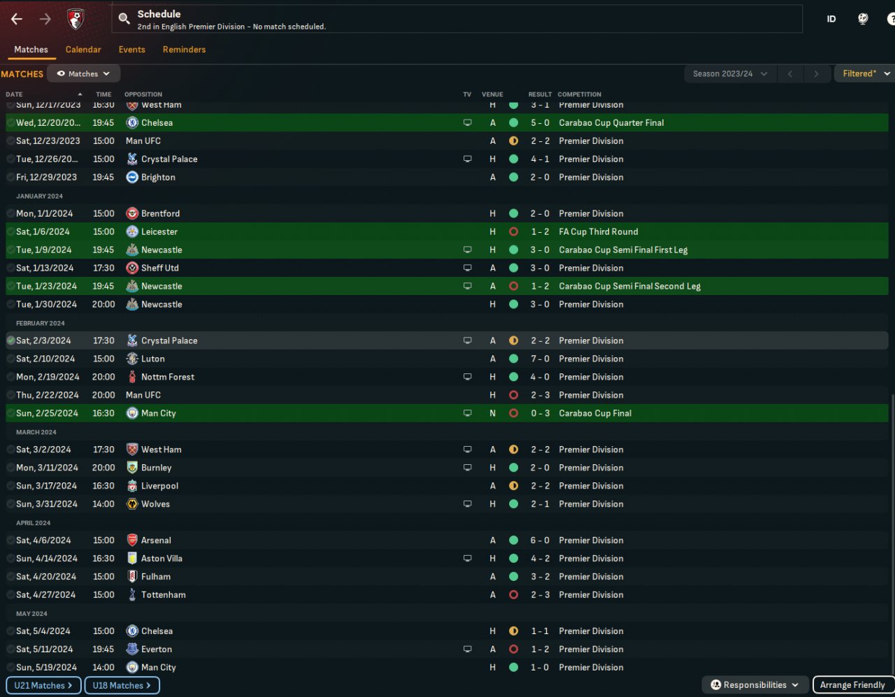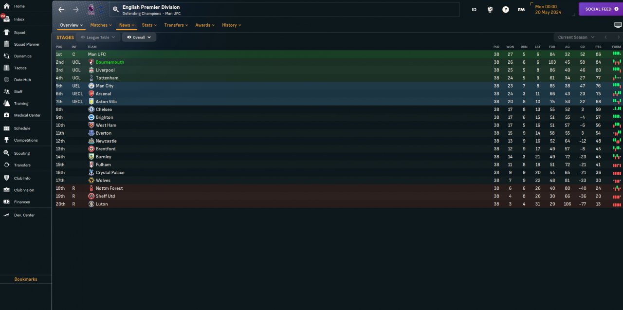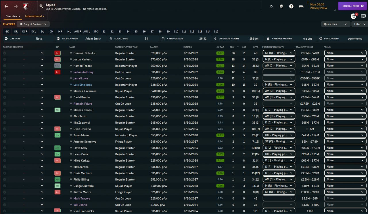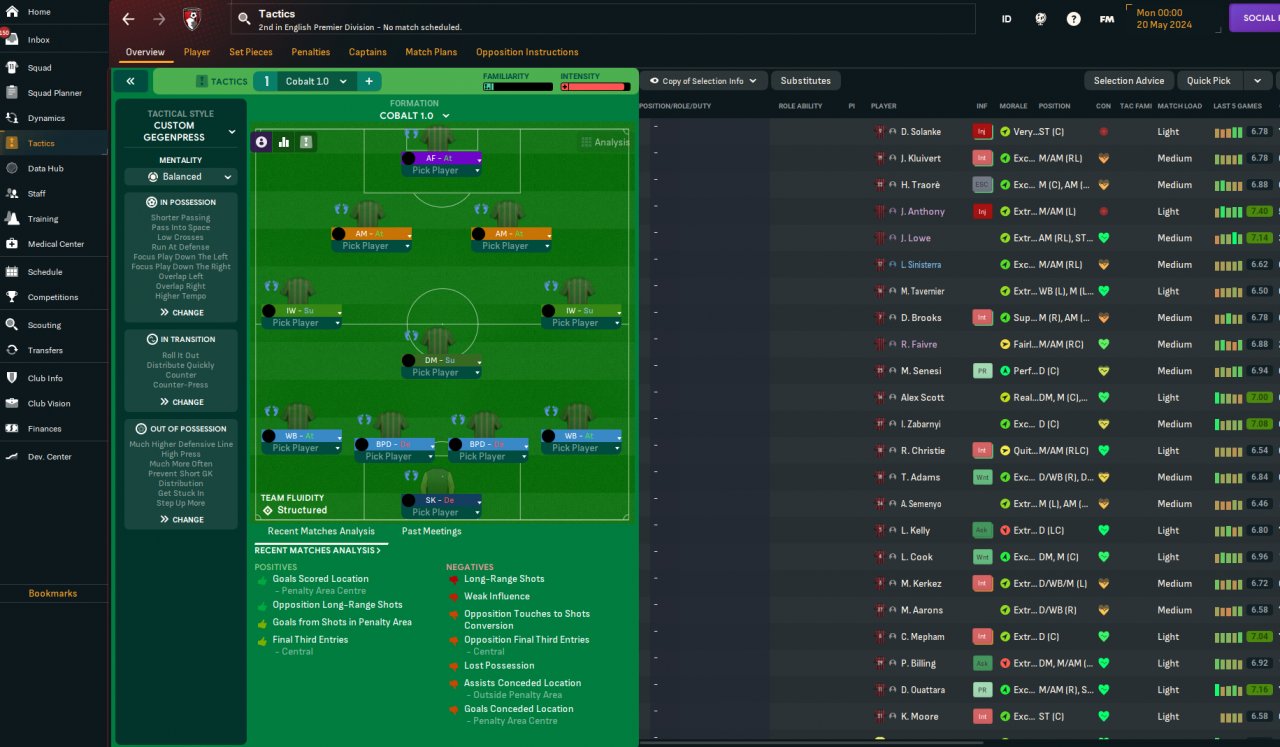 Holiday with Bournemouth , no transfers etc. attacking mentality conceded too many goals. Some PIs on my fullbacks and attacking midfield but generally quite basic.