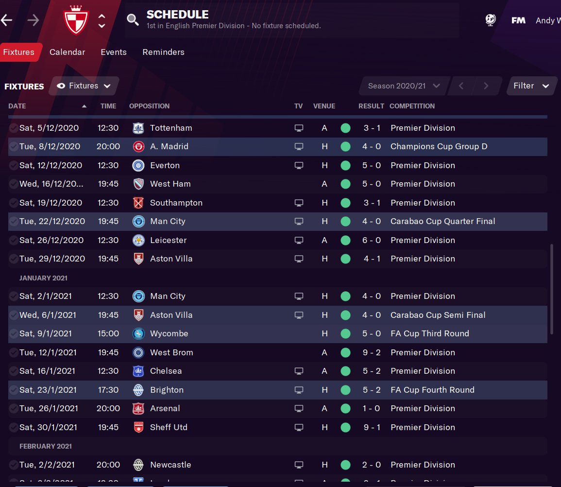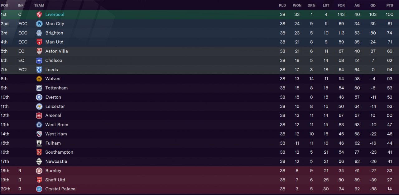 Liverpool 100 points (143 goals), 4 Trophies. Employs attacking wing-backs and attacking wingers.
