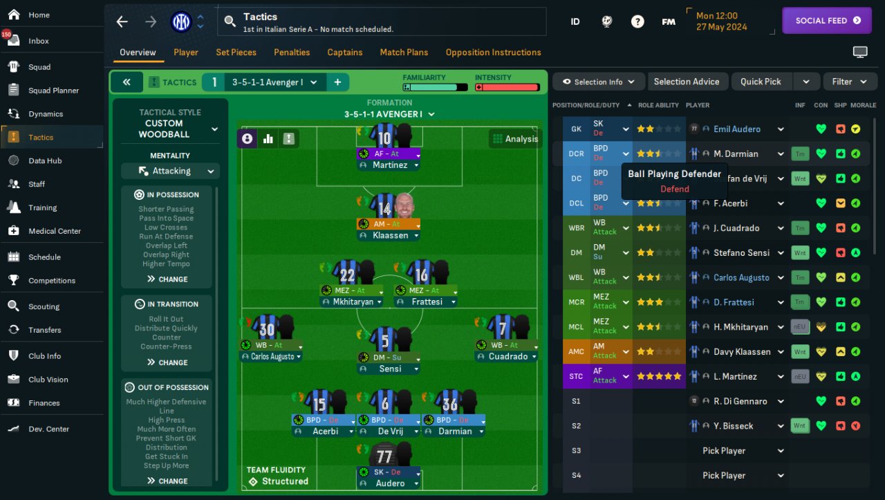 Trying this shape rarely if ever seen it tested in fm-arena, is based on my 3-5-2 Terminator XVI https://fm-arena.com/thread/7475-3-5-2-terminator-xvi/ , and it is just moving an AF into AM slot with PI to try to emulate the AF behaviour.