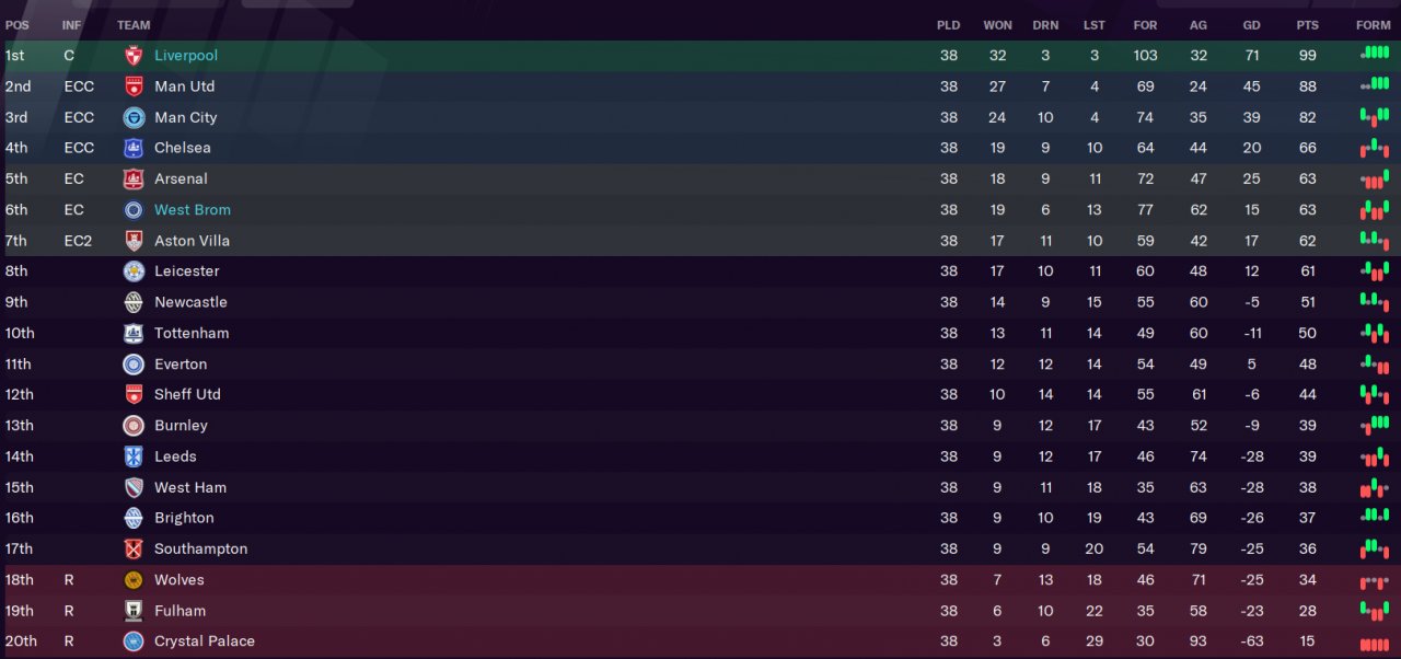 Liverpool win the Quadruple, WBA 6th in the Premier Division.