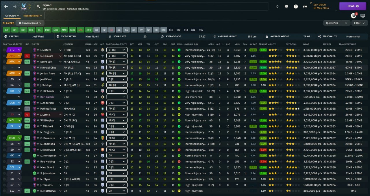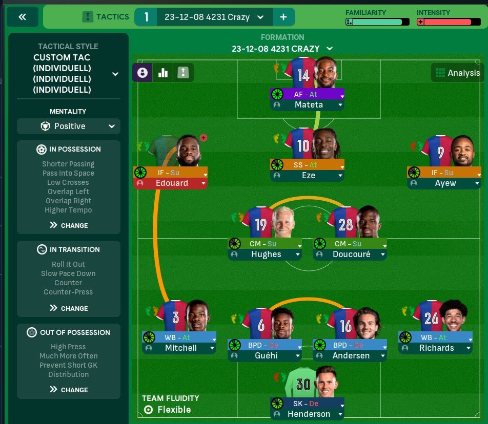 Variation of the Svonnstem with deeper defensive line, more vertical passing on most players and positive mentality. Note that for the provided images, I've switched to Crystal Palace instead of using West Ham like in the others, as West Ham scores too many goals outside of the regular game simply by the Ward-Prowse + Zouma combination. Also I haven't set up any set pieces for the experiment.