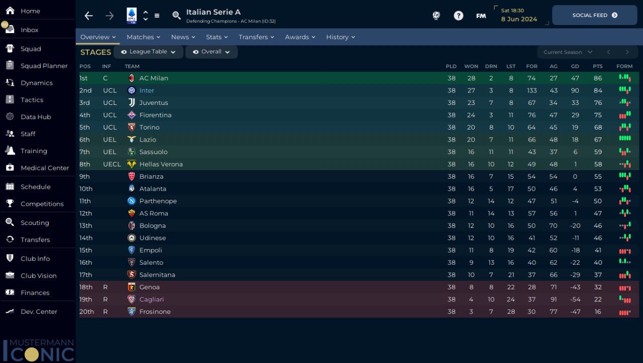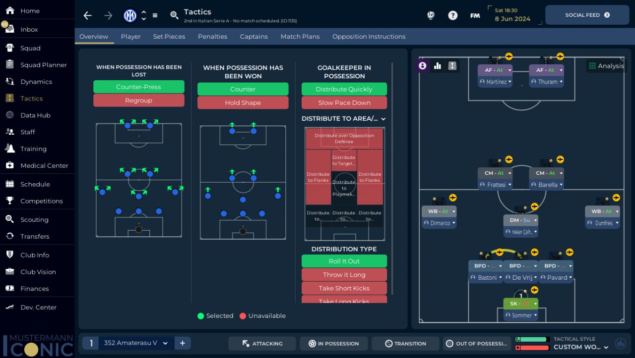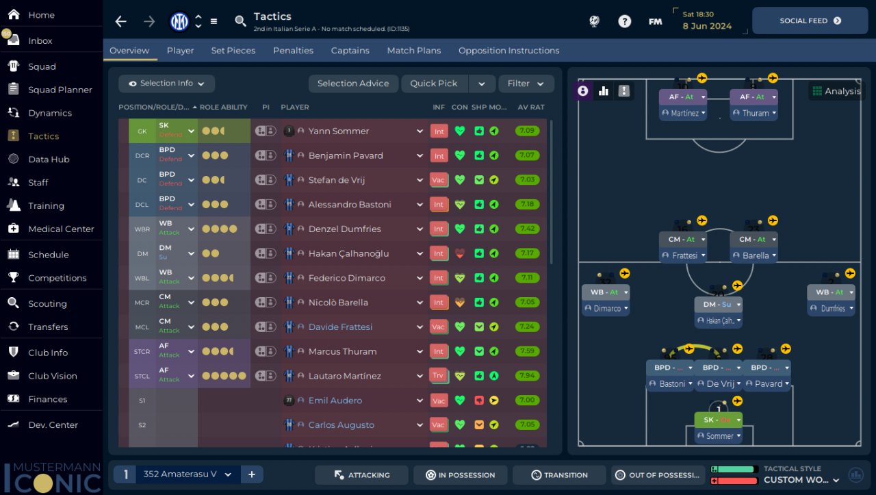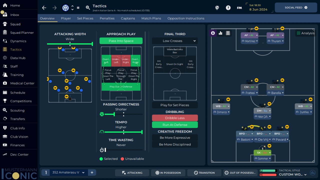 I returned to the tactic and shape 352 which is most stable with DM, and just removed some PI and added play out of defence TI and wide TI to test this