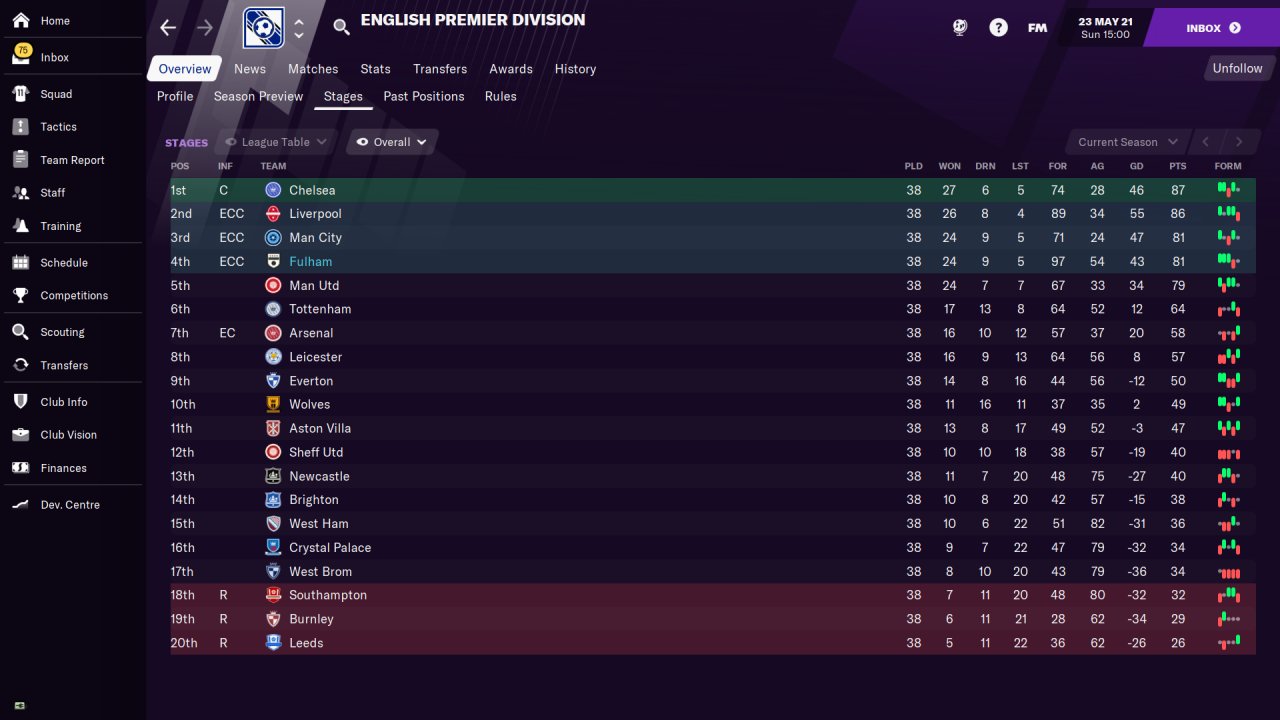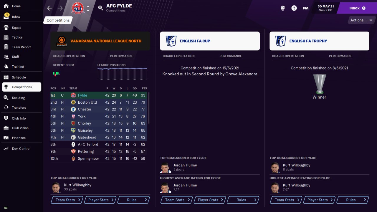 It works well enough at the top level, so I ran a couple of tests with Fulham and Fylde and they fared pretty well, achieving 81 points with Fulham and a Vanerama North / FA Trophy double with Fylde.