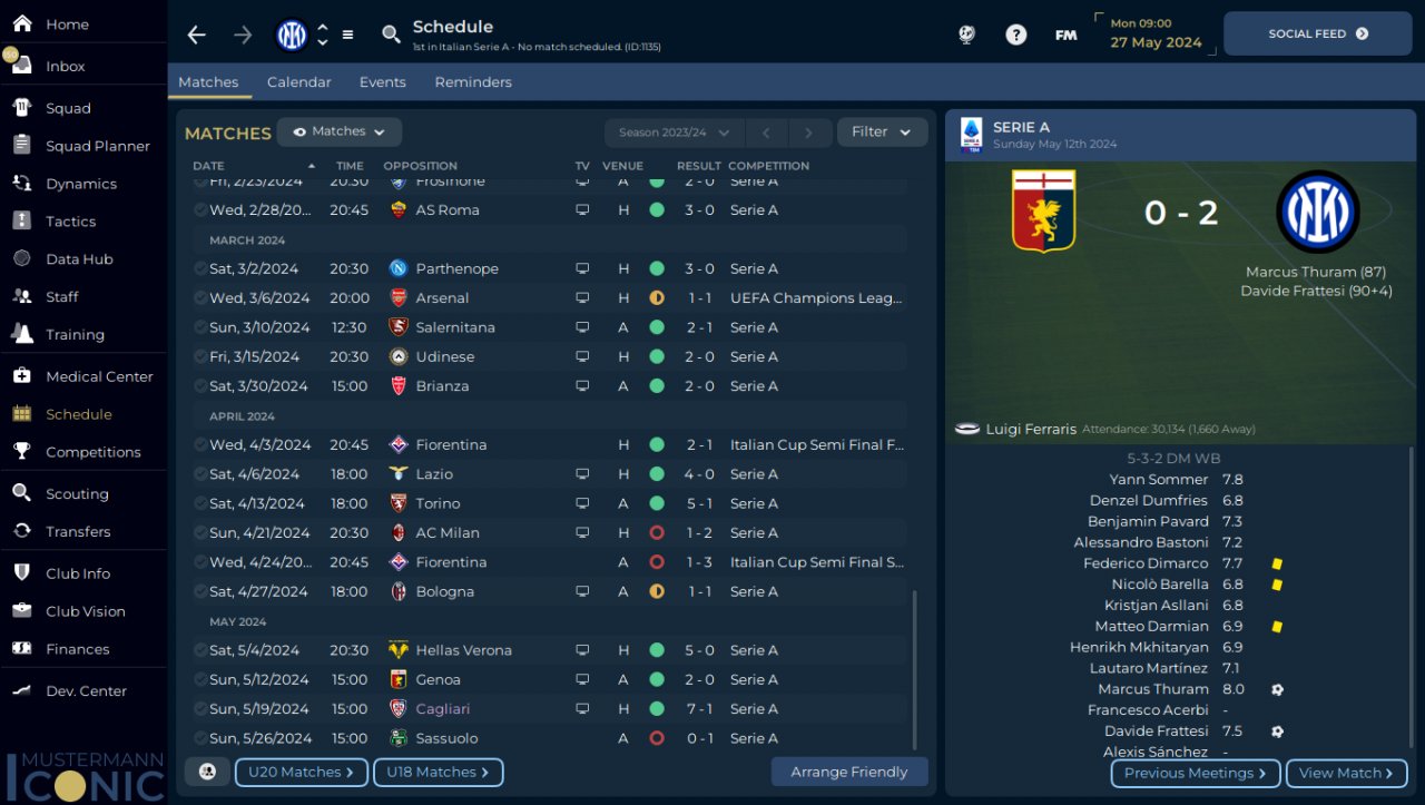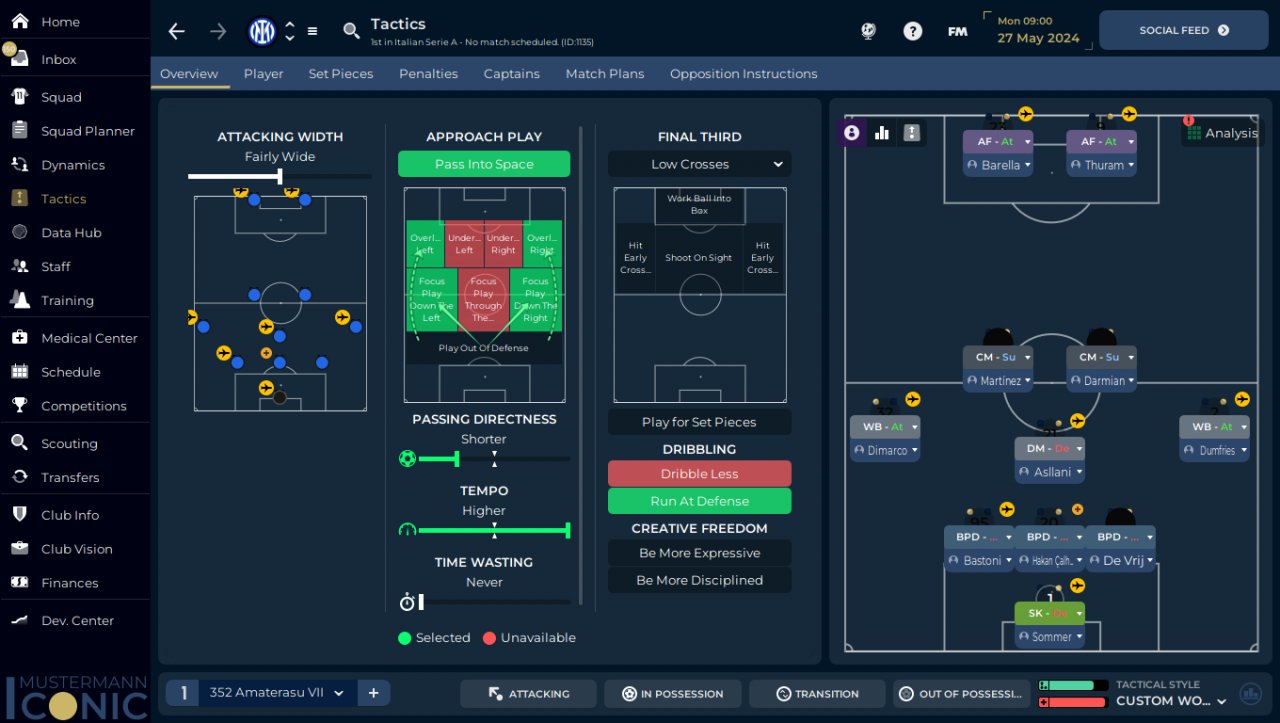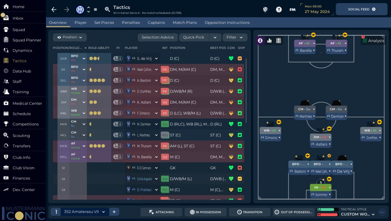 Went back to this https://fm-arena.com/thread/7774-352-amaterasu-vi/ this time i changed to my 433 midfield combination of roles and PI so dm(d) and both cm(s) also removed few PI and added focus play down both flanks to improve the overloads similar to the 433, don't expect much from points but seems interesting
