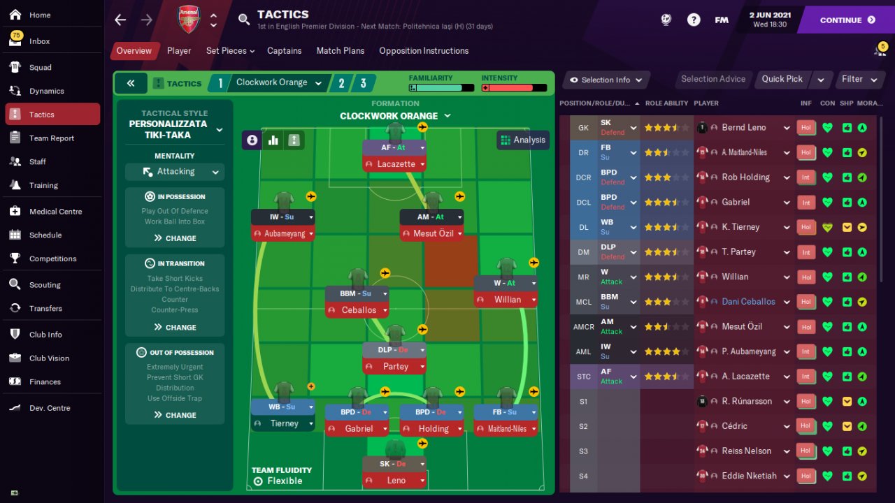 I want to share with you this tactic called Clockwork Orange that won me the Premier League and the Europa League with Arsenal in the first season and with no signings, playing nearly all of the season on holiday mode, without freezing anything (I don't have FMRTE).