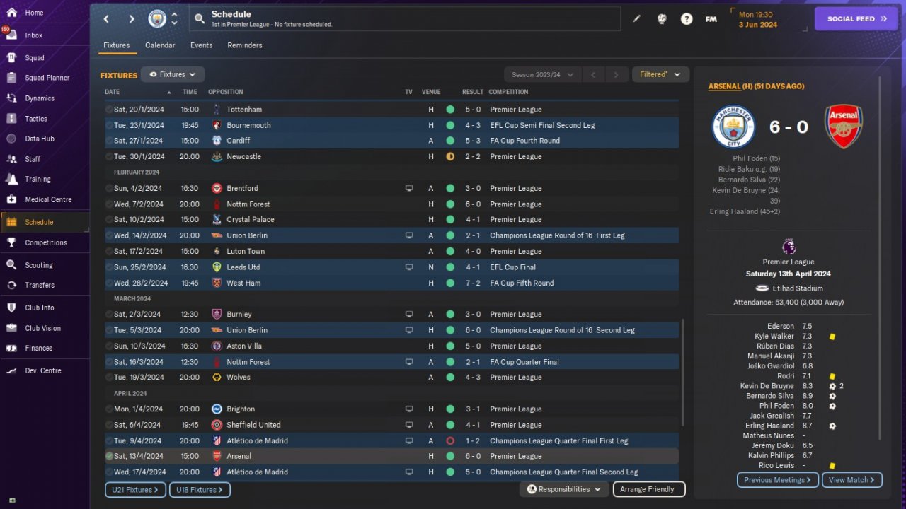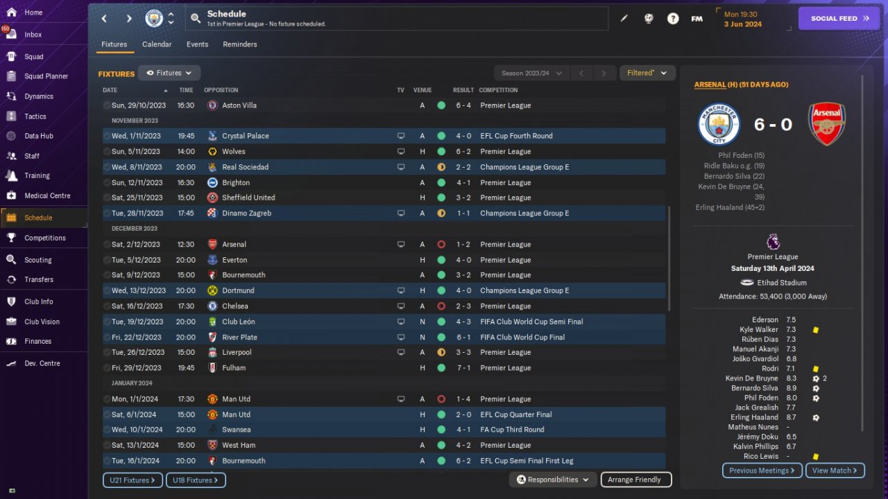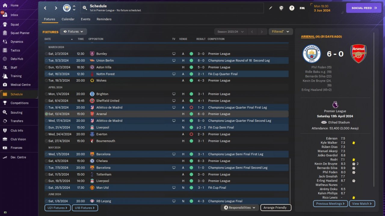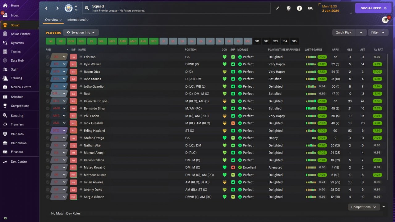 - Full-scale season test. Used holiday mode. Before start I set in only two players in to first eleven: Haaland and De Bruyne. They were key players for my tactic so they were need to play as I setted. So I locked them in to avoid assistant manager's potentially change their positions and roles (I ticked on both "use current match tactic" and "use current team selection" option tabs on holiday mode setup menu. Thanks to @CBP87 for this advice)