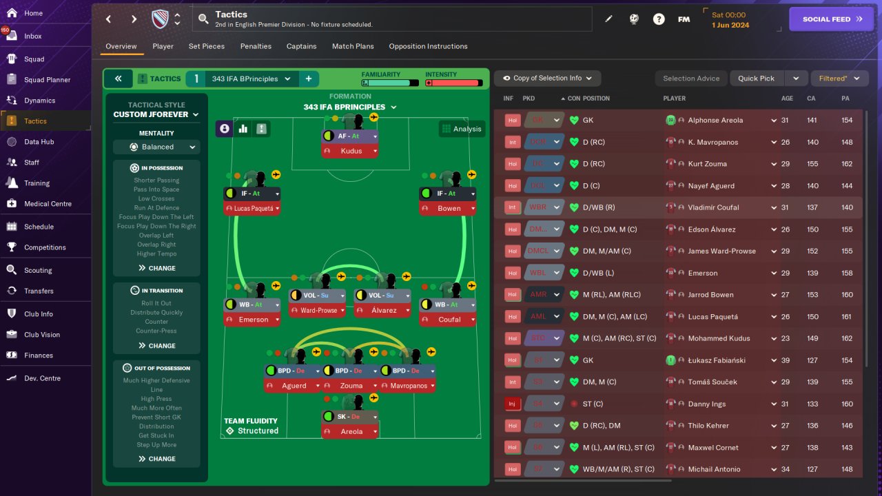 Testing out this shape with two VOL on support and the IFs on attack. It ran pretty good with West Ham and this version seems really balanced while producing a lot of goals from the front three.