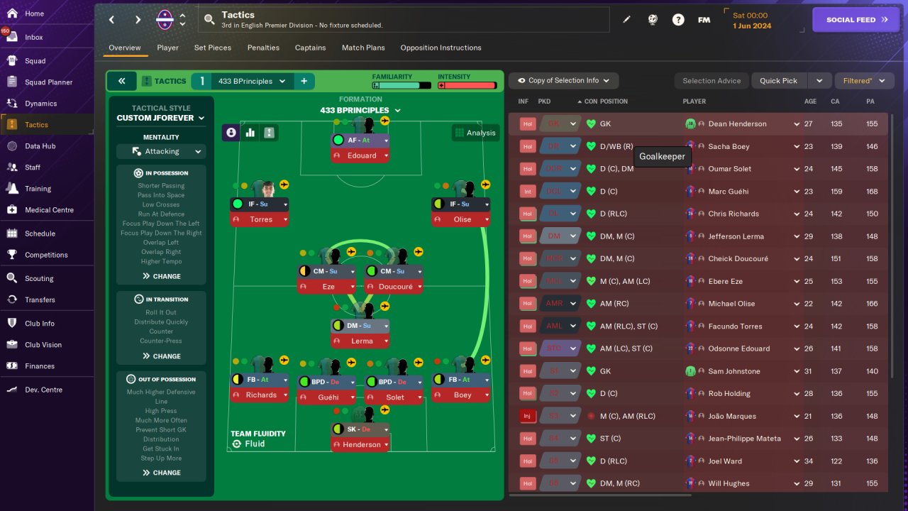 Really good league and goal result with Crystal Palace with this standard 433 with a DM. The balance between defense and attack is really good with the 2 CM on support plus they are instructed for high risk anyway so they will still provide threats.