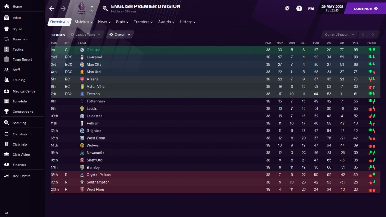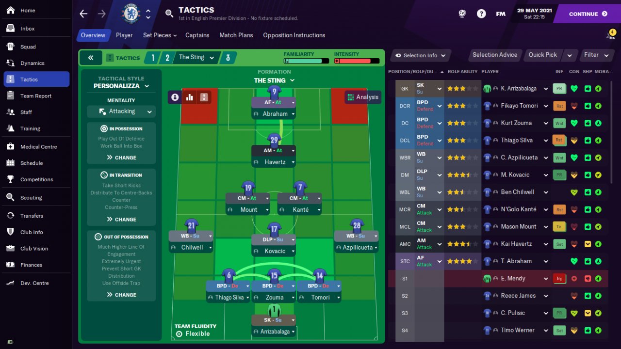 Hi everyone, here is my tactic called The Sting that gave me very good results with Chelsea during my first season (no signings). I won the Premier League with best attack and best defence, and reached the Champions League Final where I lost against Liverpool on extra times. I hope you enjoy it.