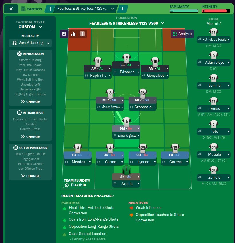 Hi, I created the previous verison of this tactic (v666) that was tested on FM Arena with a rating of 6.7 - since then i've been working to try and create a better version, especially defensively, as offensively the tactic is very prolific. I have since come up with a few new versions that we've been testing on my thread on fm-base (https://fm-base.co.uk/threads/fearless-strikerless-4123.166664/), however i believe i've now found the right balance between all versions (created sort of a hybrid with the best performing elements of each) and would like to request if you can please test it on your platform so we can make an in depth comparison with the previous version.