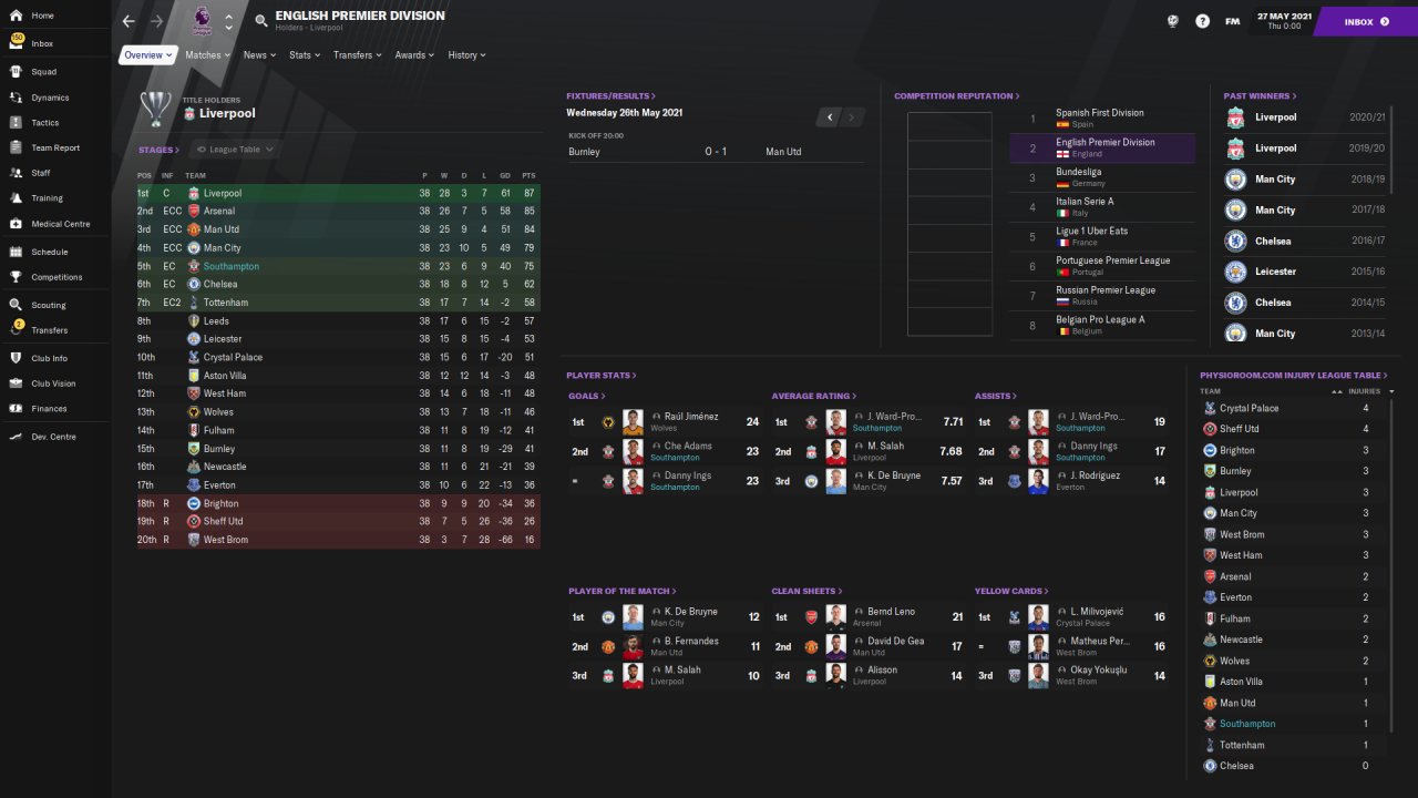 Southampton media expecations mid table ish finish 5th with 75pts tally.
